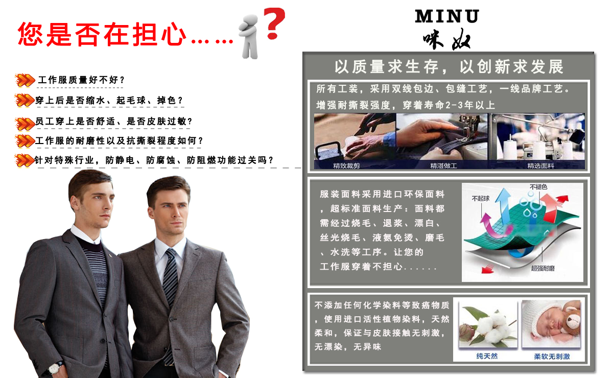 一家集設計,制版,生產,銷售為一體服裝企業。公司制服部專業為企業團體“量身訂做”各種制服、工作服、廠服等。公司建立了完善的專業化、一體化的企業服務體系。本著“以質量求生存,以創(chuàng)新求發(fā)展”管理理念,重視觀念更新,全面引進最新電腦設備及先進縫紉技術,加強高工藝培訓,由技術精湛、經驗豐富的設計師及工藝師們組成的設計部,可根據客戶的企業文化氛圍、經營風格和理念等特殊需求進行全新的富有獨特創(chuàng)意的設計和制作。